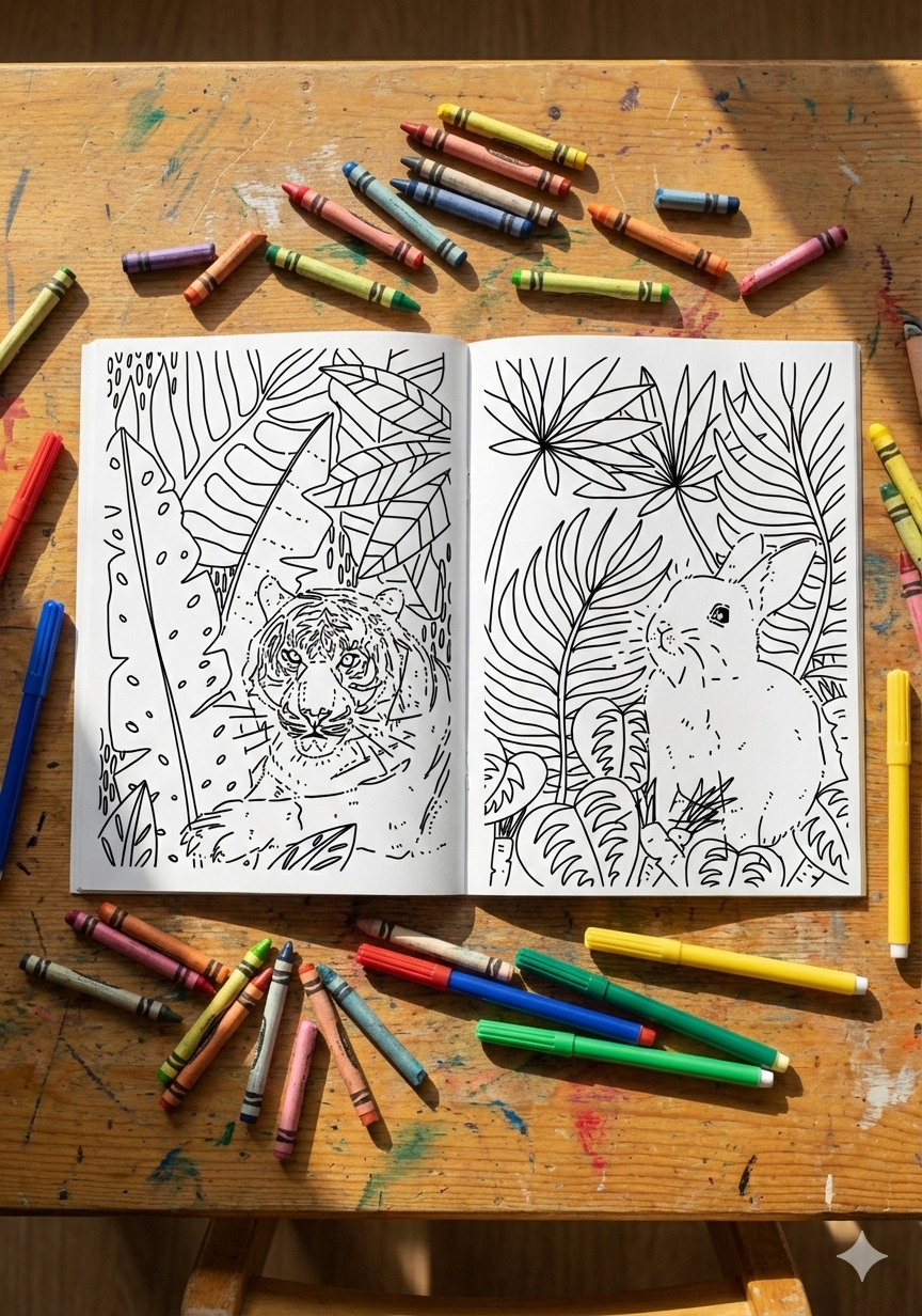 Environmental Integration: Designed 25 distinct compositions featuring diverse animal wildlife seamlessly woven into lush, overlapping tropical foliage. The layouts prioritize spatial depth and natural framing to create a deeply immersive coloring experience.