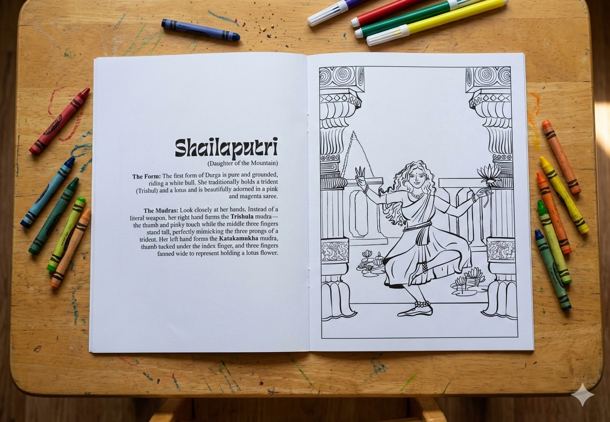 The Concept: An interactive, self-published coloring book exploring the nine forms of Goddess Durga (Navadurga) through the lens of classical Bharatanatyam. It bypasses literal depictions of deities with weapons, instead using the dancer’s expressive geometry and hand gestures (mudras) as the vessel for the divine.