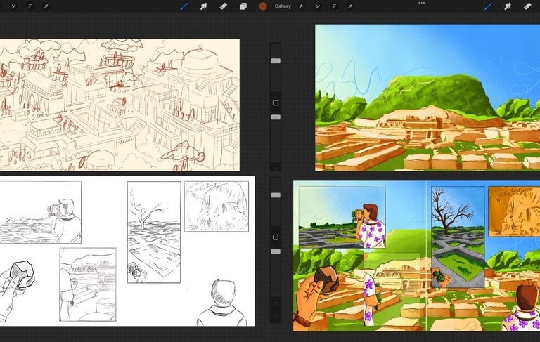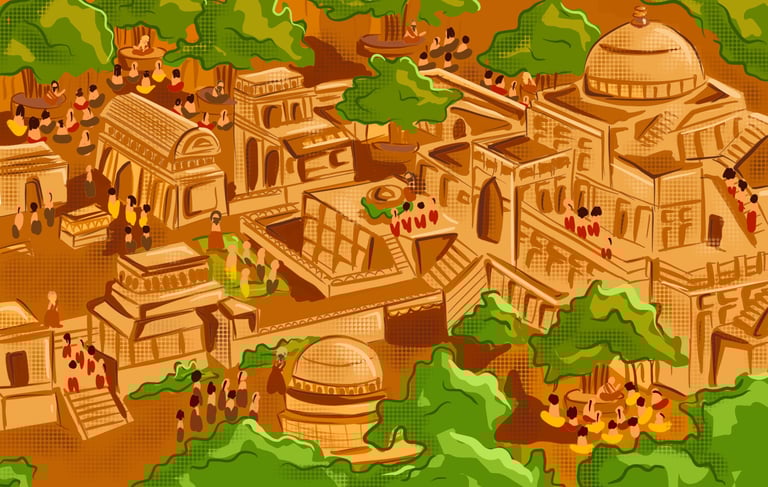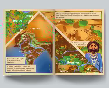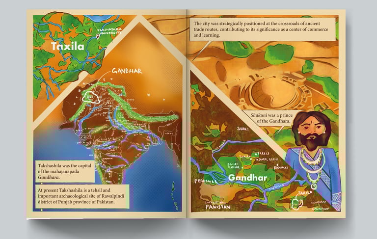The Concept: A digital graphic novel reimagining the world’s first university, Takshashila. The narrative is driven by a dialogue between a curious traveler and a mysterious guide, serving as a vehicle to explore the forgotten marvels and profound history of this ancient educational epicenter.