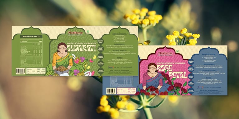 The Concept: A label design for a traditional Gujarati flavor mukhwas (mouth freshener). The client needed a design that felt deeply authentic, nostalgic, and culturally rooted, while also functioning strictly as a compliant food label containing dense nutritional data.